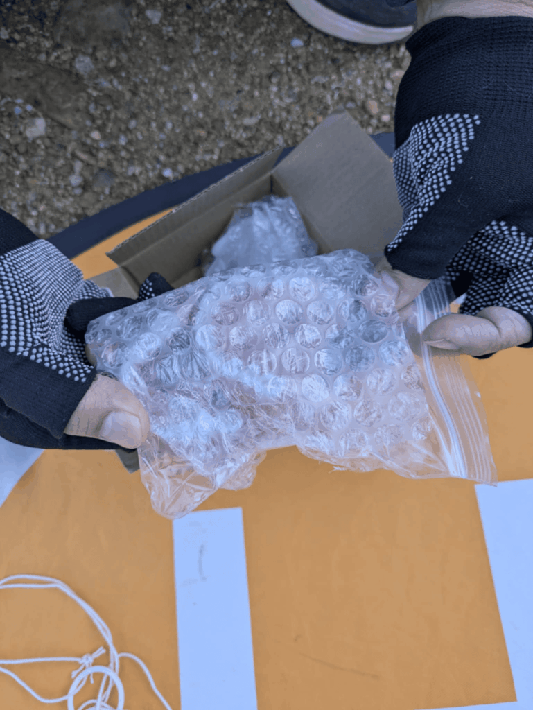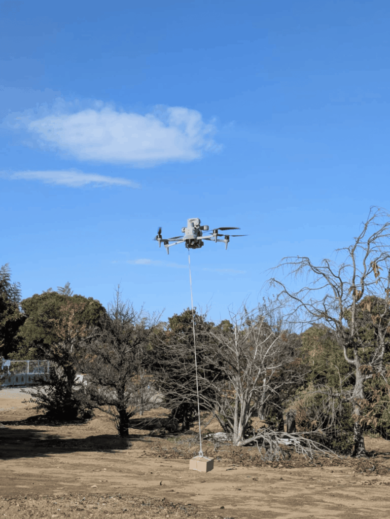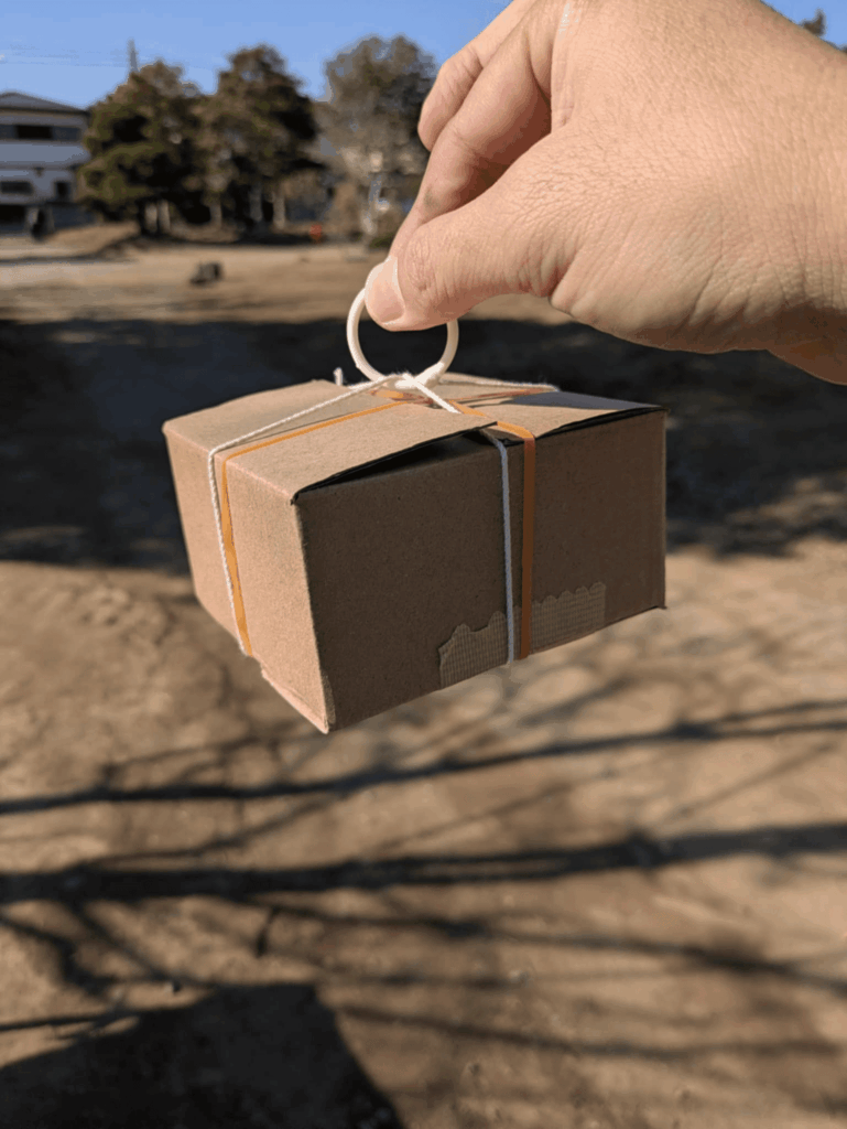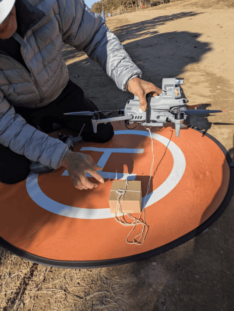 ●風の影響で紐が揺れ、着陸時の絡まりリスクがあるため、「受け渡し時はドローンを着陸させ紐ごと取り外す方法が安全」と判断